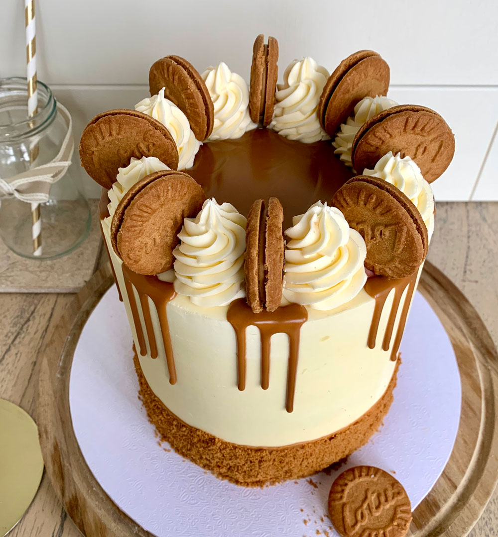 A brown sugar and vanilla sponge cake layered with caramel buttercream and Biscoff spread. Decorated with white chocolate ganache, biscoff drip, biscoff biscuits and whipped vanilla buttercream