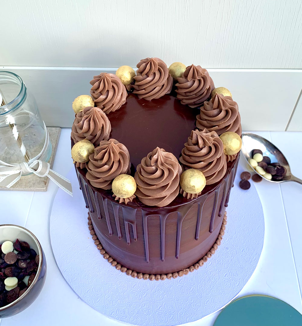 Six layers of soft luxurious chocolate sponge cake sandwiched together with chocolate fudge frosting and enrobed with a dark chocolate ganache.