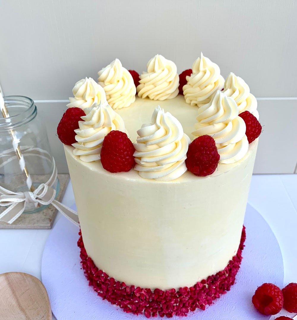 Zesty lemon sponge cake filled with lemon buttercream and raspberry compote. Covered with a rich white chocolate ganache and finished with vanilla buttercream and fresh raspberries.